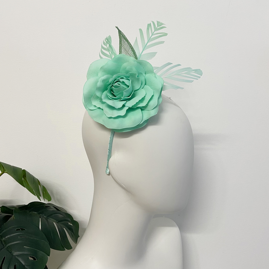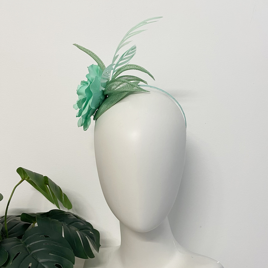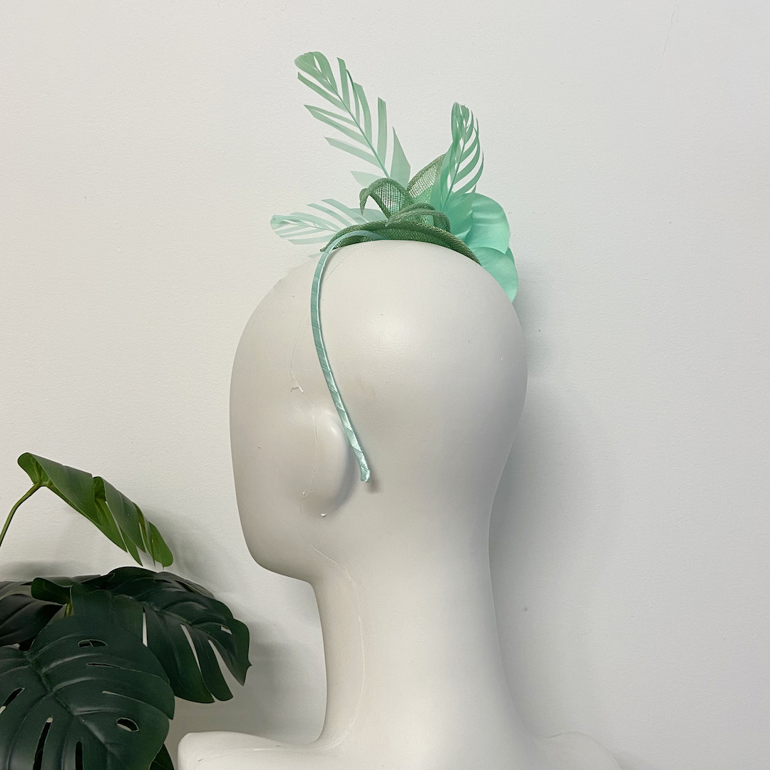 Mint green fascinator with sinamay leaves, flower and feathers. Clasp type: Head band