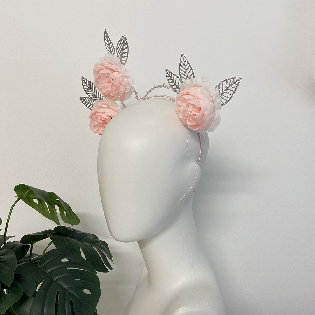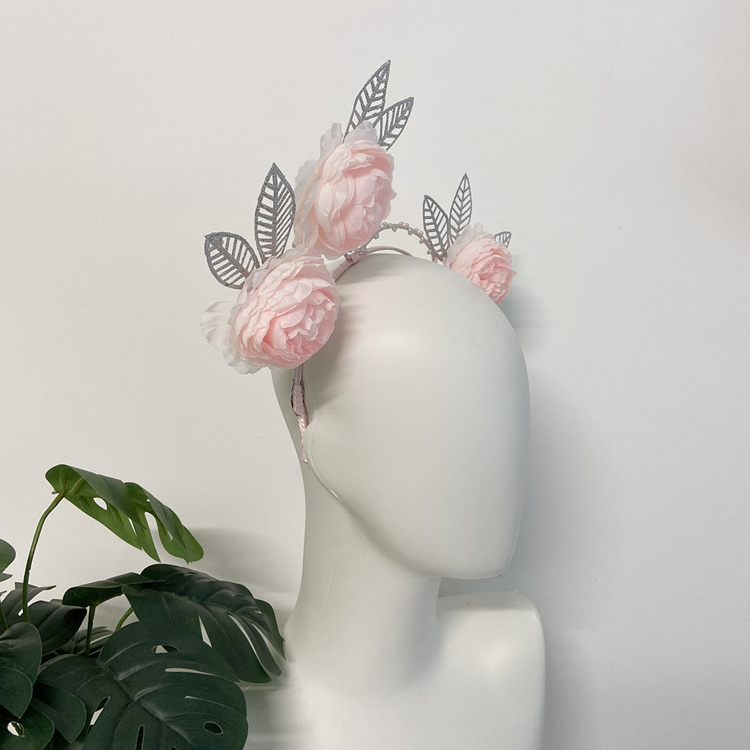 Baby Pink fascinator with flowers, silver leaves and pearls on a headband.